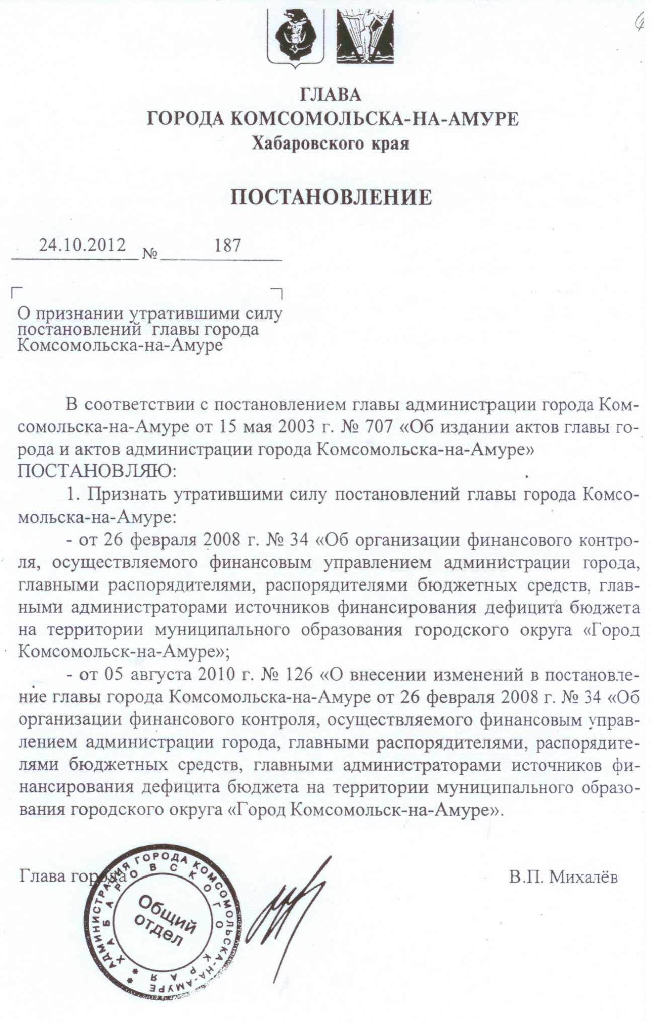 - 12 июля 2019 Постановление главы города от 24.10.2012 № 187 «О признании утратившими силу постановлений главы города Комсомольска-на-Амуре»